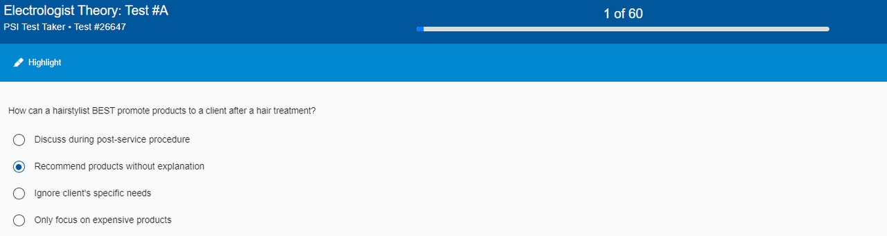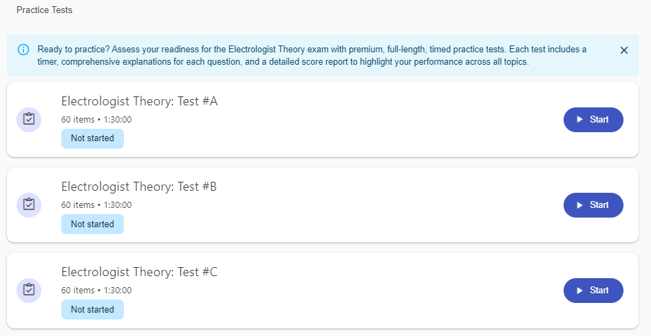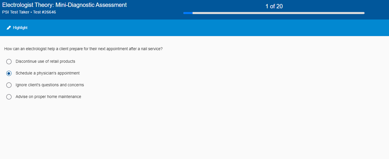 Designed to simulate your test-day experience, PSI premium practice tests mirror the national Electrologist Theory test’s objectives and feature sample questions similar to those you’ll see on the actual test.