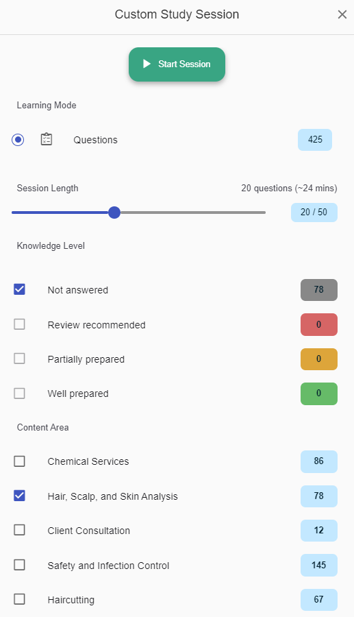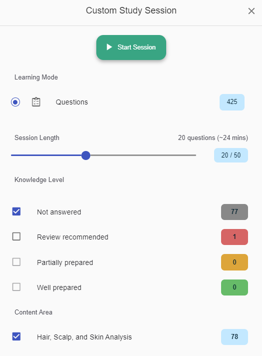 • Generate custom study sessions by topic and knowledge level