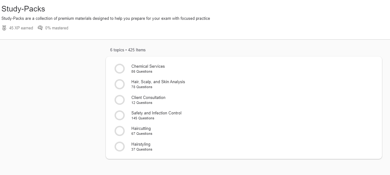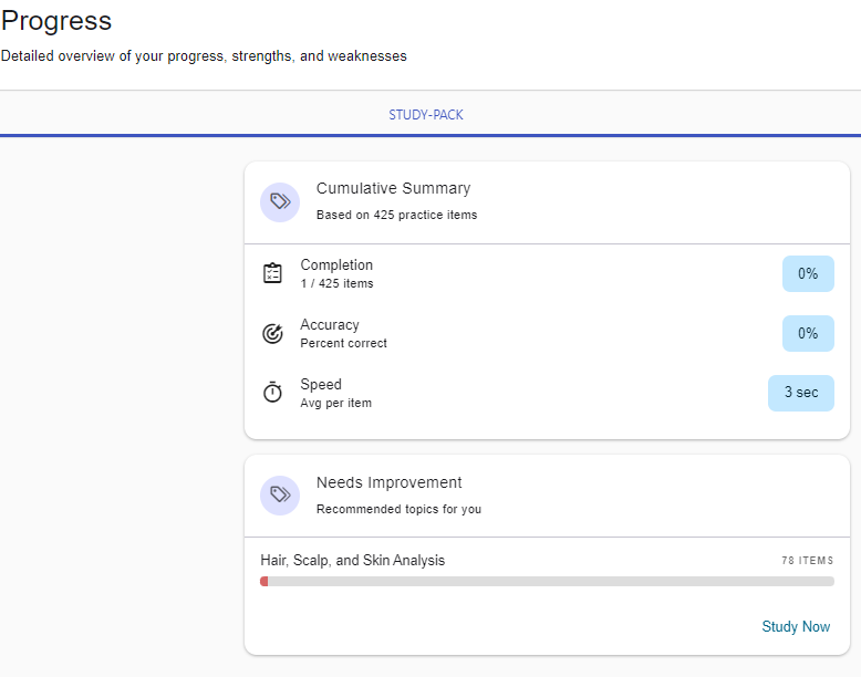 The Cosmetology Theory Study-Pack follows PSI’s national content outlines to help you advance your understanding and pinpoint where you need to improve.
