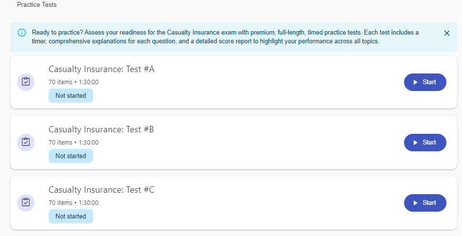 Designed to simulate your test-day experience, PSI premium practice tests mirror the national Casualty Insurance test’s objectives and feature sample questions similar to those you’ll see on the actual test.