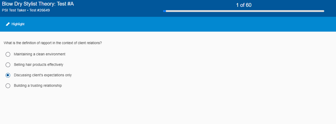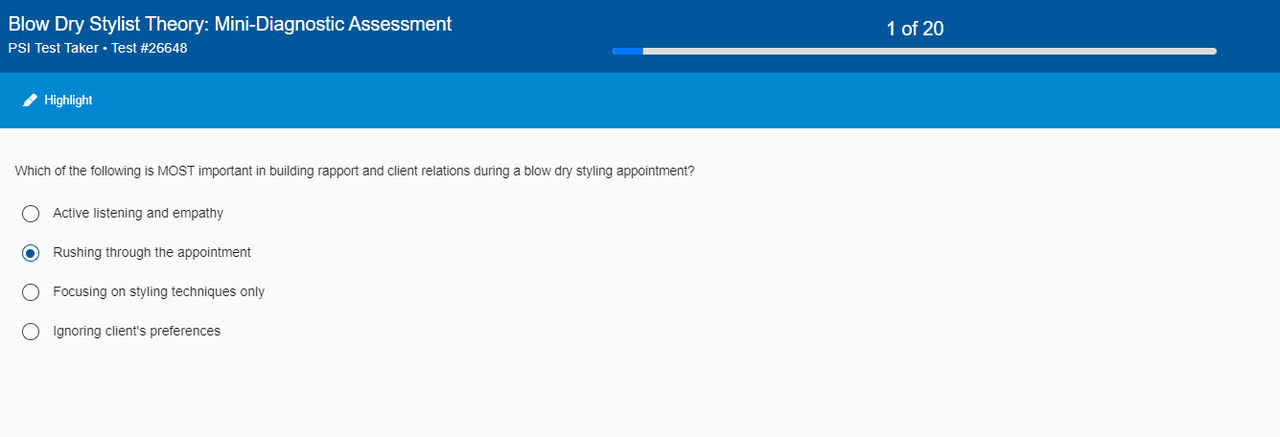 Designed to simulate your test-day experience, PSI premium practice tests mirror the national Blow Dry Stylist Theory test’s objectives and feature sample questions similar to those you’ll see on the actual test.