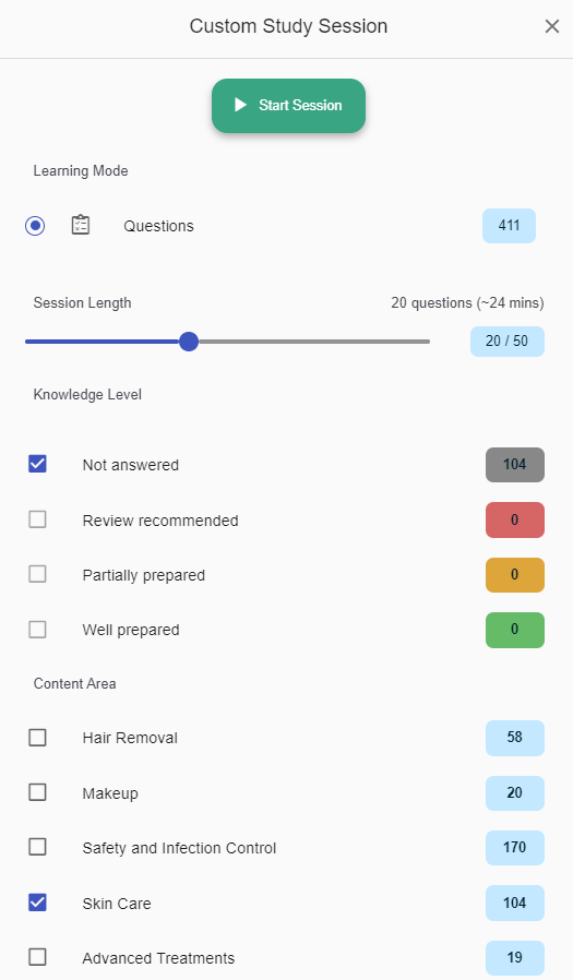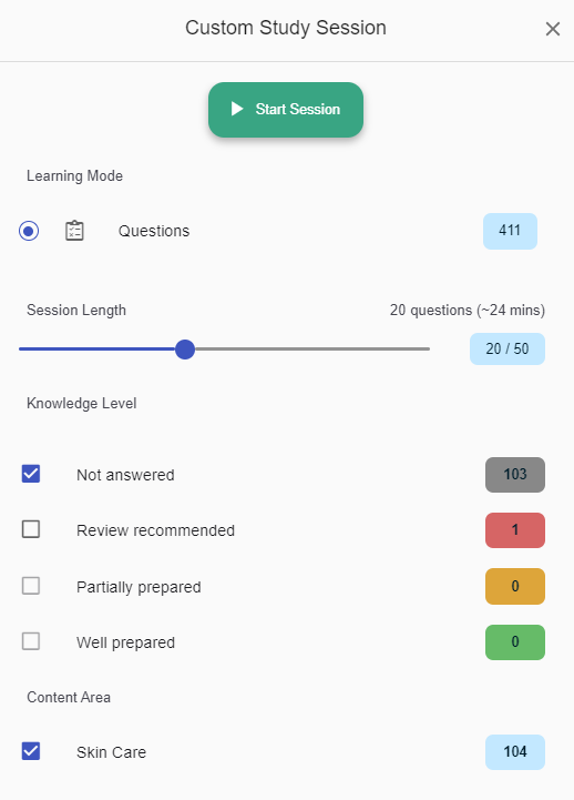 • Generate custom study sessions by topic and knowledge level
