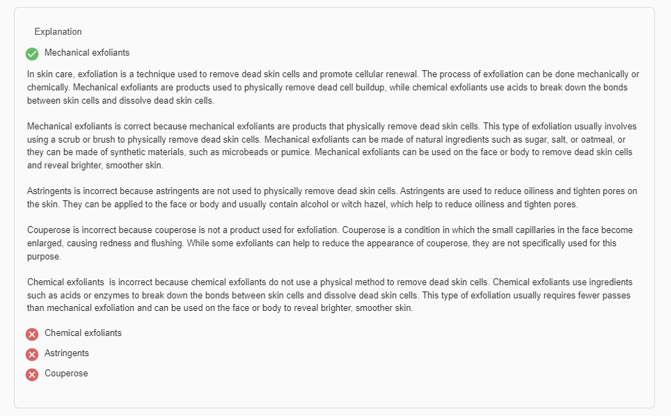 • Each question comes with explanations, topic breakdown, and references
