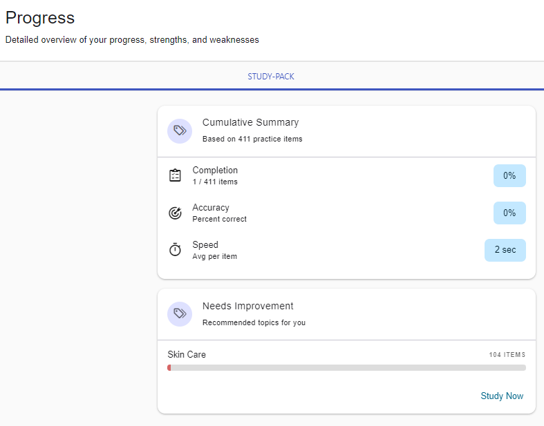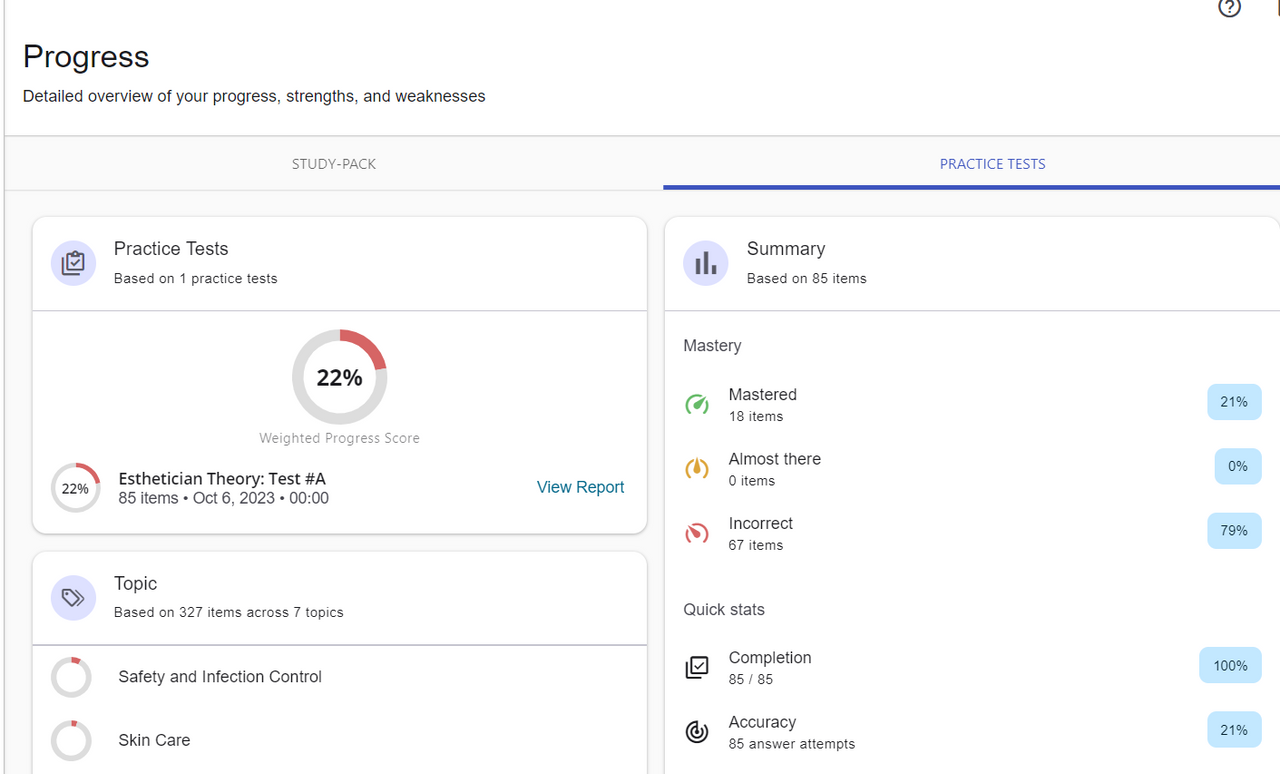 - Detailed study progress and insights across all major topic areas