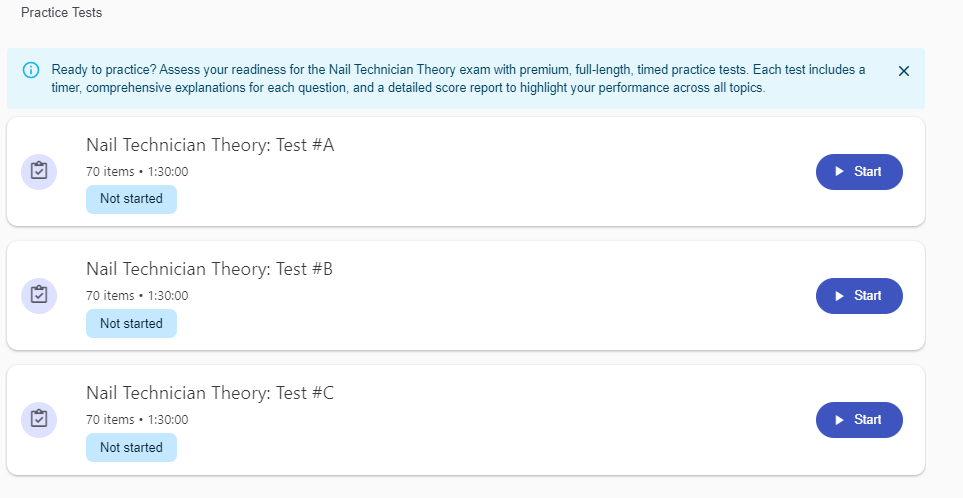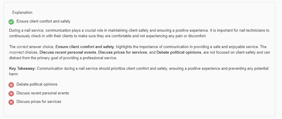 Confidently prepare for your Nail Technician Theory exam with practice questions, explanations, progress tracking, and more! Brought to you by the experts from PSI.