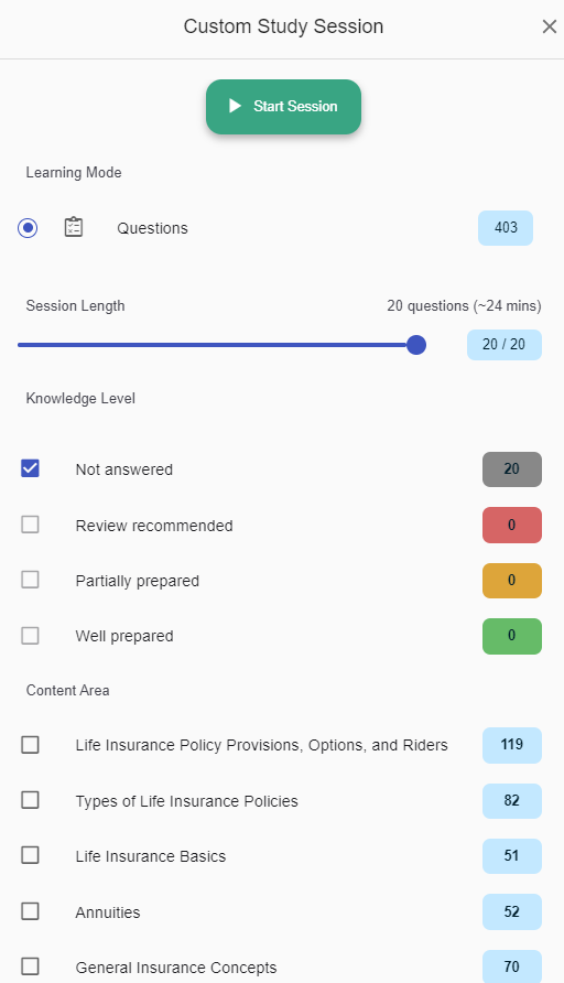 • Sesiones de Estudio Personalizables: Genera sesiones de estudio personalizadas por tema y nivel de conocimiento, cubriendo todas las áreas relevantes según el esquema de contenido del examen de Seguro de Vida.