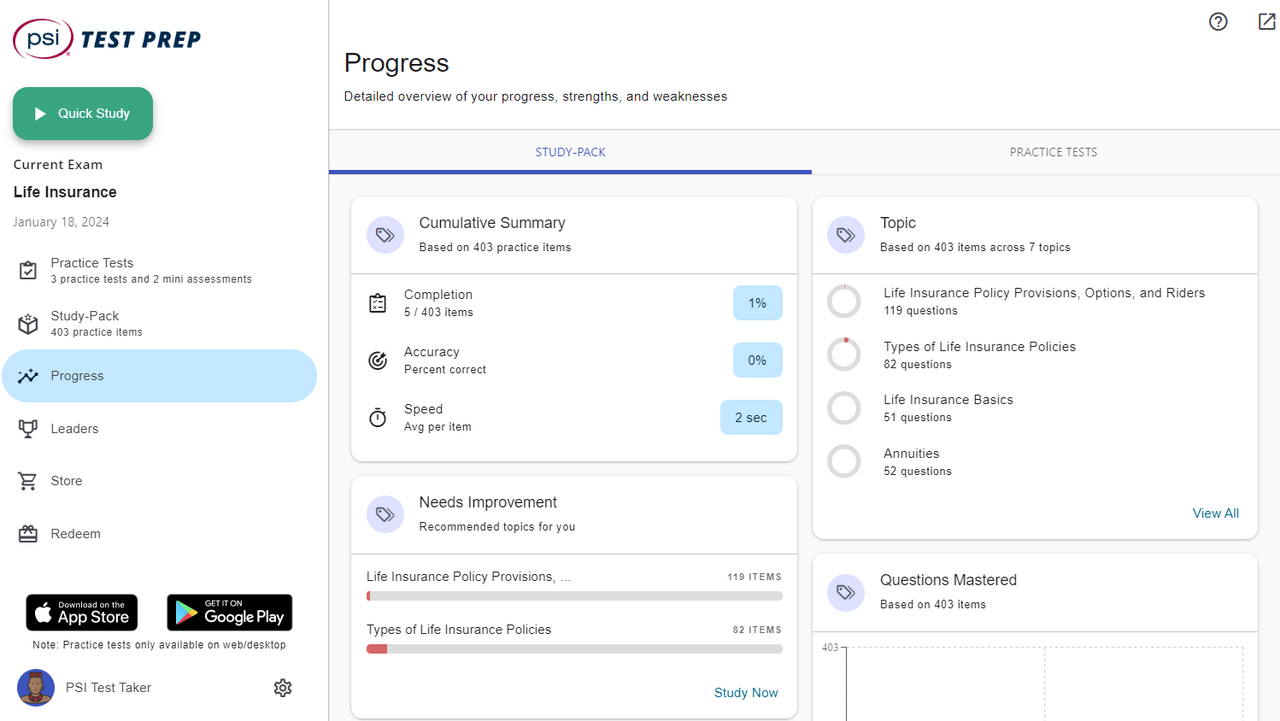Confidently prepare for your Life Insurance exam with practice questions, explanations, progress tracking, and more! Brought to you by the experts from PSI.