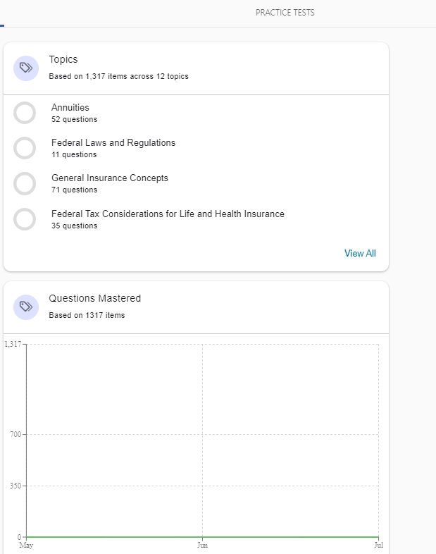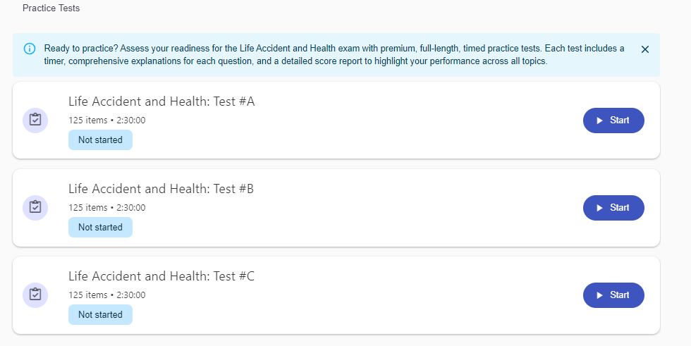 Diseñadas para simular tu experiencia en el día del examen, las pruebas prácticas premium de PSI reflejan los objetivos del examen nacional de Seguros de Vida, Accidentes y Salud, e incluyen preguntas de muestra similares a las que verás en el examen real.