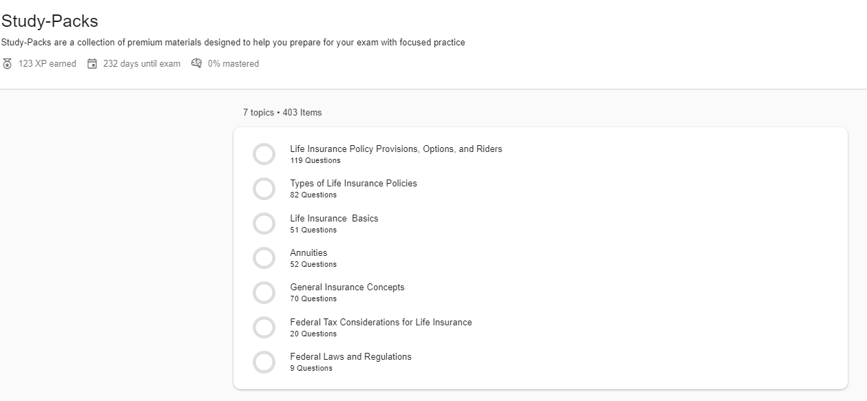 • Sesiones de Estudio Personalizables: Genera sesiones de estudio personalizadas por tema y nivel de conocimiento, cubriendo todas las áreas principales relevantes para el esquema de contenido del examen de Vida, Accidentes y Salud.