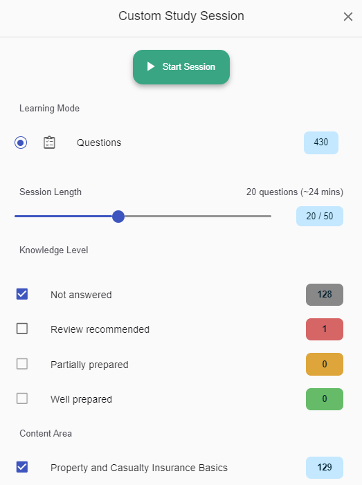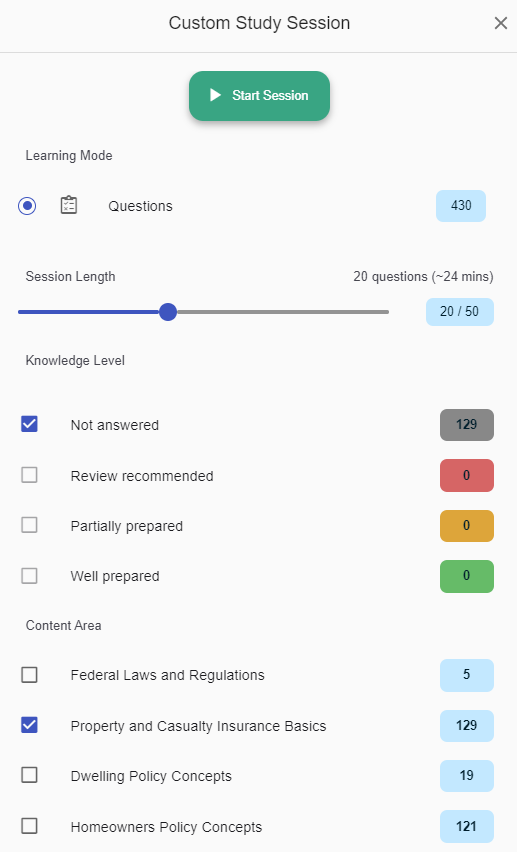 El Paquete de Estudio para Seguros de Líneas Personales sigue los lineamientos de contenido nacionales de PSI para ayudarte a mejorar tu comprensión y detectar exactamente en qué áreas necesitas enfocarte.