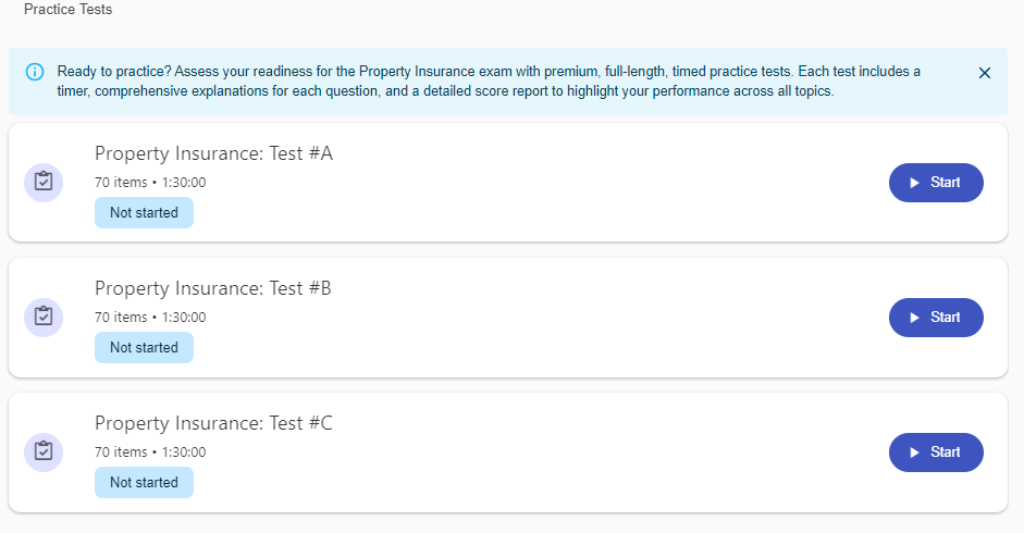 Designed to simulate your test-day experience, PSI premium practice tests mirror the national Property Insurance test’s objectives and feature sample questions similar to those you’ll see on the actual test.