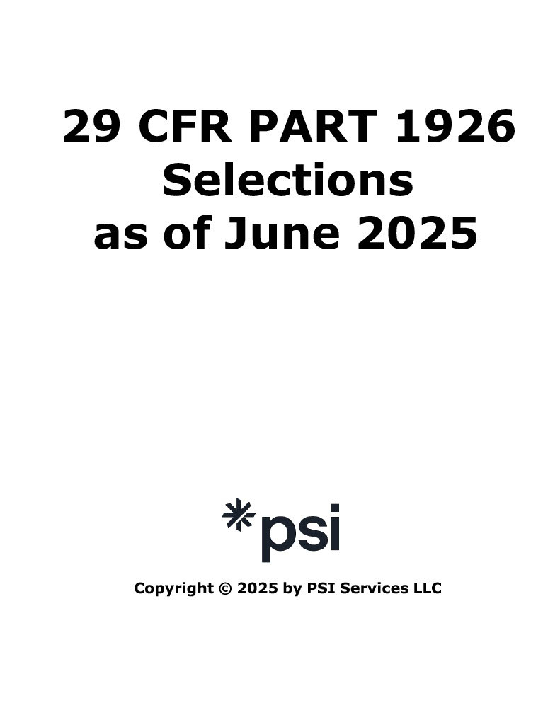29 CFR Part 1926 Selections by PSI (OSHA) with latest available amendments contains all of the pertinent OSHA 1926 sections needed for the PSI Contractor and Construction Industry tests. This publication is made available to test takers for their convenience as an alternative to purchasing the full and more voluminous OSHA 1926 publication.